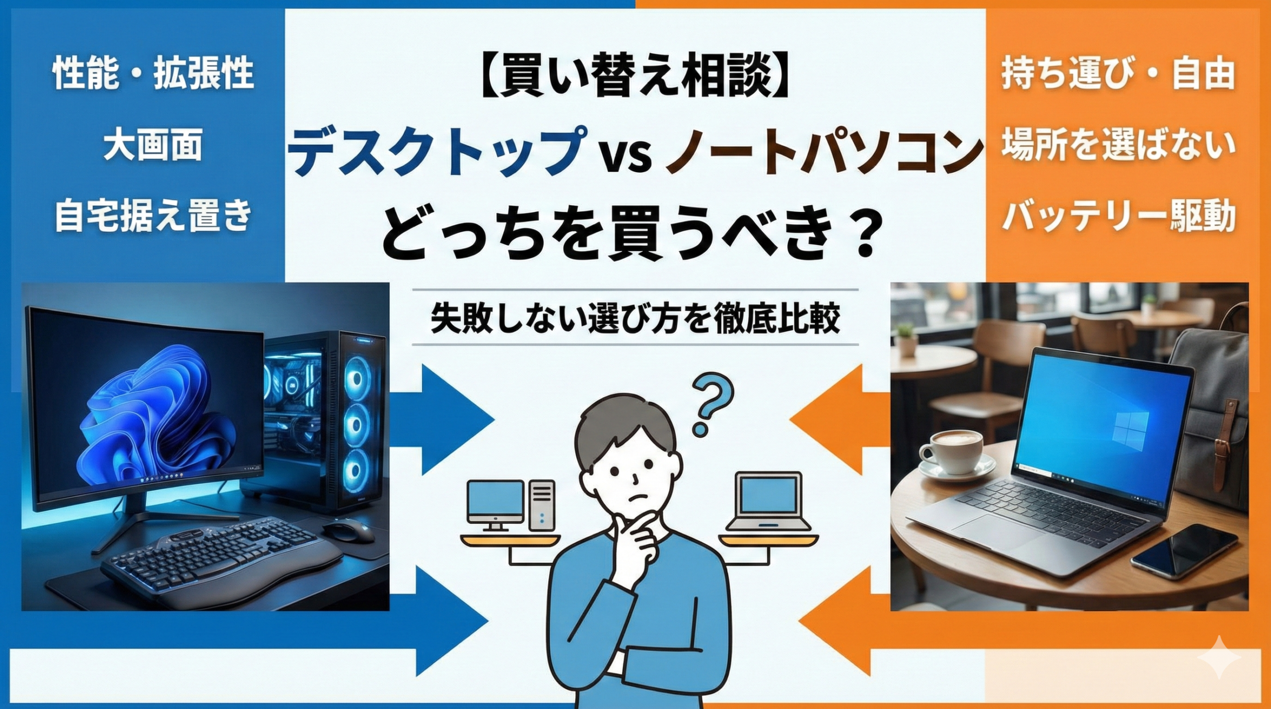 「パソコンが壊れてしまった…次はどれを買えばいいんだろう?」「今までノートパソコンだったけど、持ち歩かないからデスクトップの方がいいのかな?」パソコンの買い替え時期になると、必ずぶつかるのが「デスクトップにするか、ノートにするか」という悩みです。安い買い物ではないので、絶対に失敗したくないですよね。結論から言うと、迷ったら「ノートパソコン」を選べば間違いありません。しかし、「特定の目的」がある人にとっては、デスクトップの方が圧倒的に幸せになれる場合があります。この記事では、あなたのライフスタイルや使い方に合わせて、どちらを選ぶべきかをプロの視点で判定します。