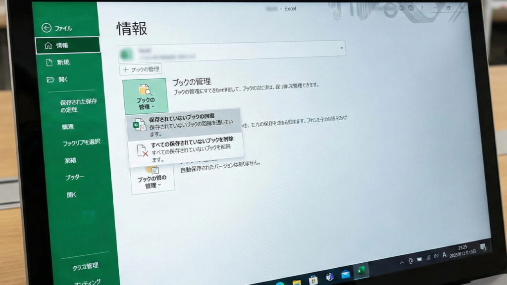 - 消えたデータは「ブックの管理」から探す