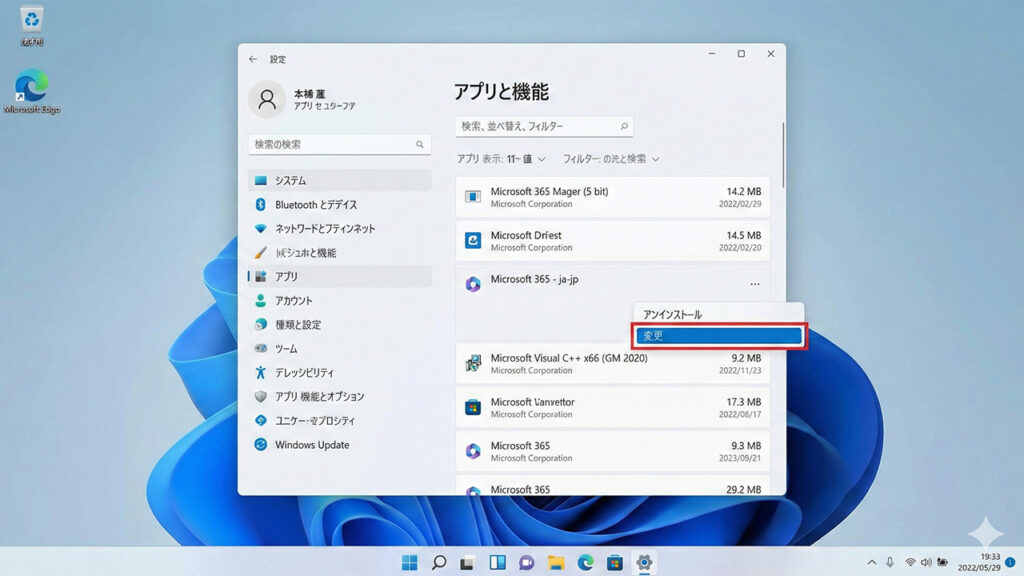 - 右端の「…」をクリックし、「変更」を選びます。