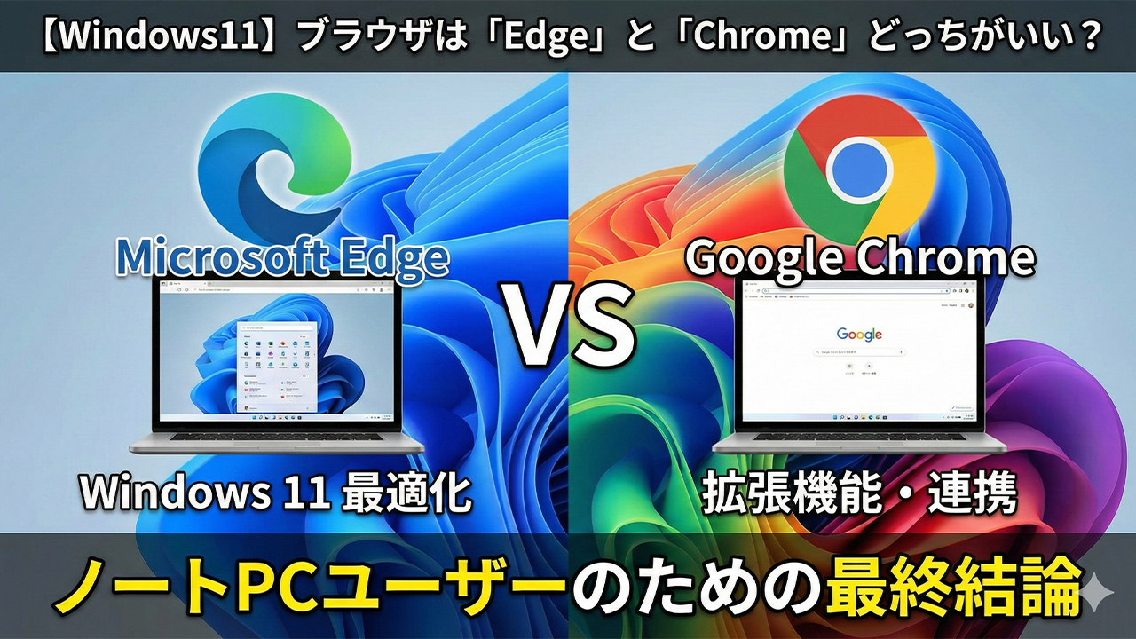 新しいWindows 11のパソコンを買って最初に悩むのが、インターネットを見るためのソフト(ブラウザ)選びです。「Microsoftは『Edge(エッジ)』を猛プッシュしてくるけど、使いにくくない?」「今まで通り『Google Chrome(クローム)』を入れたいけど、Windows 11と相性が悪い?」そんな疑問をお持ちのあなたへ。結論から言うと、実はこの2つ、中身は「親戚」のような関係で、性能に大きな差はありません。しかし、「普段使っているスマホ」や「パソコンのスペック」によって、おすすめは変わります。この記事では、ChromeとEdgeのメリット・デメリットを比較し、あなたにピッタリなブラウザを判定します。