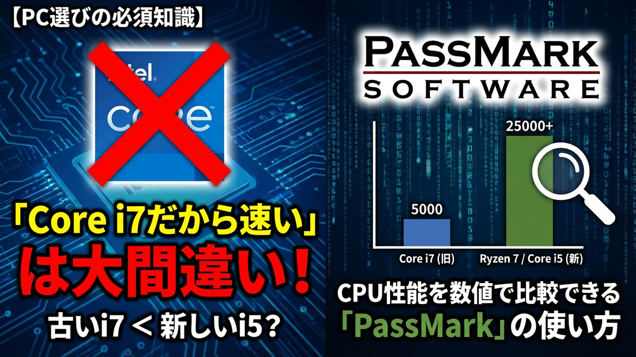 「中古のCore i7搭載パソコンが3万円!安い!」「新品だけど聞いたことのないCPUが入っている…これ買っても大丈夫?」パソコンを買う時、CPUの型番(名前)だけで選んでいませんか?実は、「10年前のCore i7」よりも「最新のCore i3」の方が性能が圧倒的に高いということはよくあります。名前だけで判断して「遅くて使えないPC」を掴まされないために見るべきなのが、CPUの戦闘力を数値化したサイト「PassMark(パスマーク)」です。今回は、プロも必ずチェックしているこのサイトの使い方と、快適に使えるスコアの基準を分かりやすく解説します。