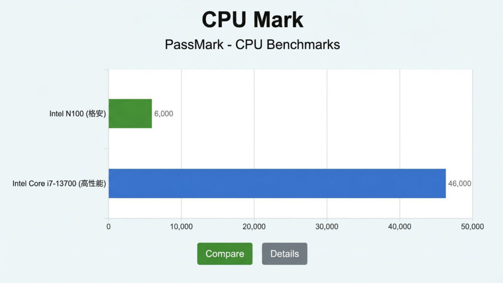 | 3,000 〜 6,000 | △ ギリギリ | ネット閲覧や動画再生ならOK。最近流行りの格安ミニPC(Intel N100等)はこの辺りです。 |