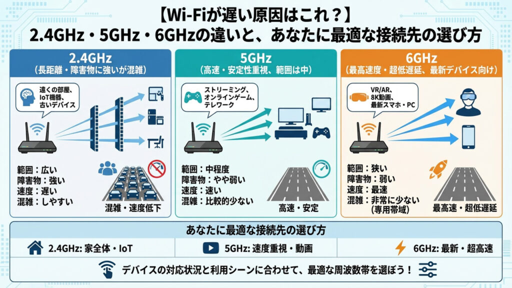 「家のWi-Fi、リビングでは速いのに寝室に行くと繋がらない…」「電子レンジを使うと動画が止まる…」その悩み、もしかすると「接続する周波数」を間違えているだけかもしれません。今のWi-Fiルーターからは、主に2つ(最新機種なら3つ)の異なる電波が飛んでいます。これらは「道路」のようなもので、それぞれ得意・不得意があります。今回は、「2.4GHz」「5GHz」「6GHz」の違いと、状況に合わせた正しい使い分け方を解説します。