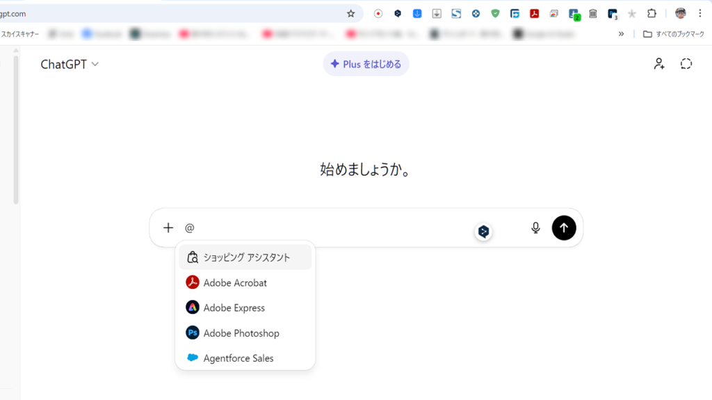 チャットの入力欄に半角で@と打ち込んでみてください。すると、連携できるGPTsのリストがポップアップ表示されます。