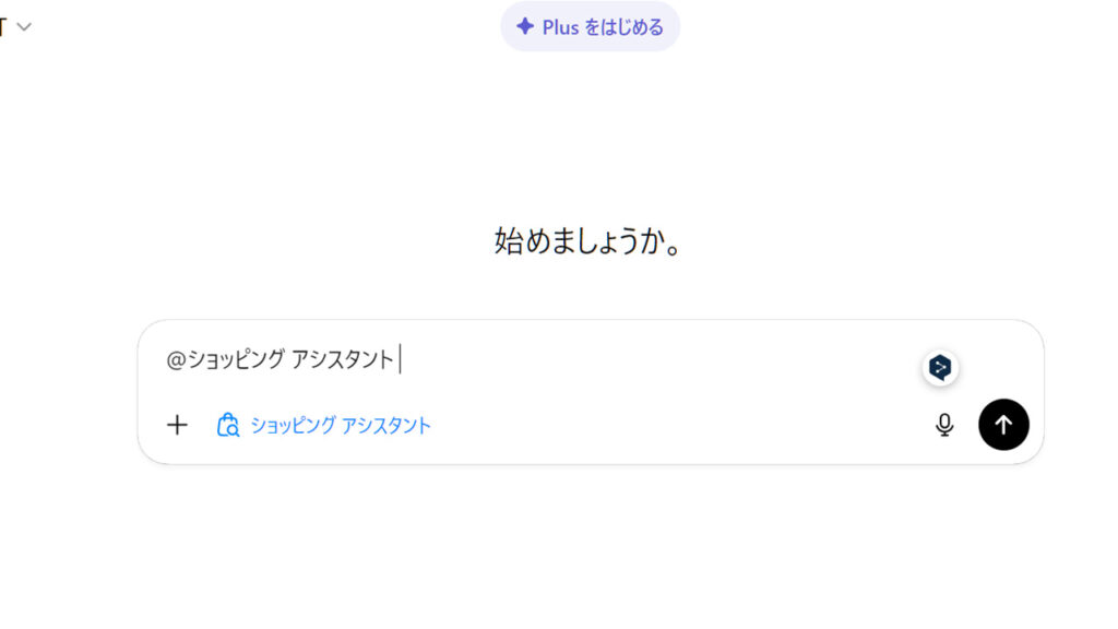 リストの中からショッピングアシスタントをクリックして選択します。 ※表示されない場合は、「GPTを探す」から「ショッピングアシスタント」と検索して追加しておくと、次回から@で呼び出せるようになります。