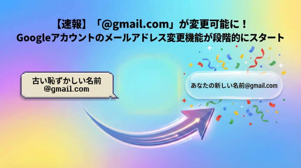 - これまで: 一度決めた「〇〇@gmail.com」は一生変更不可。変えたい場合は、別のアカウントを新規作成し、データを(手動で苦労して)移すしかなかった。