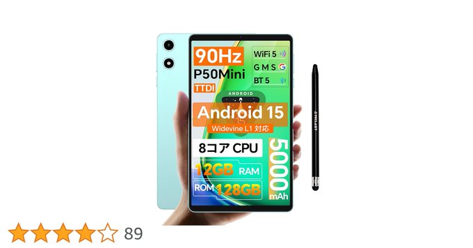 【8 インチ タブレット 全新登場 】TECLAST P50Mini Android 15 タブレット90Hzの高リフレッシュレート、8.7インチ wi-fiモデル、12GB RAM+128GB+1TB 、8コア T7200 CPU、340g超軽量、Widevine L1 Netflix対応+GMS+5G WIFI+5000mAh+BT5.0+GPS+OTG+無線投影、電子書籍向け・タッチペン付き…