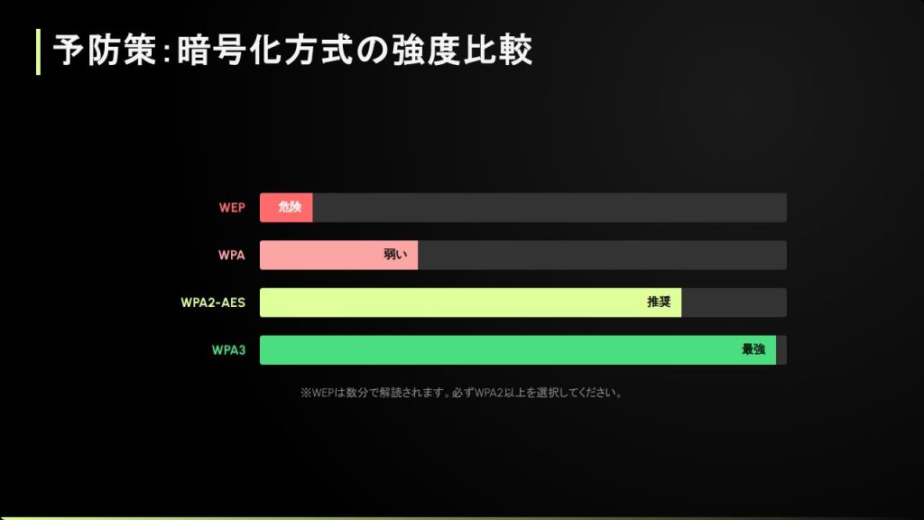 「WEP」という古い方式は数分で解読されてしまいます。現在は「WPA2-AES」または最新の「WPA3」を選択してください。