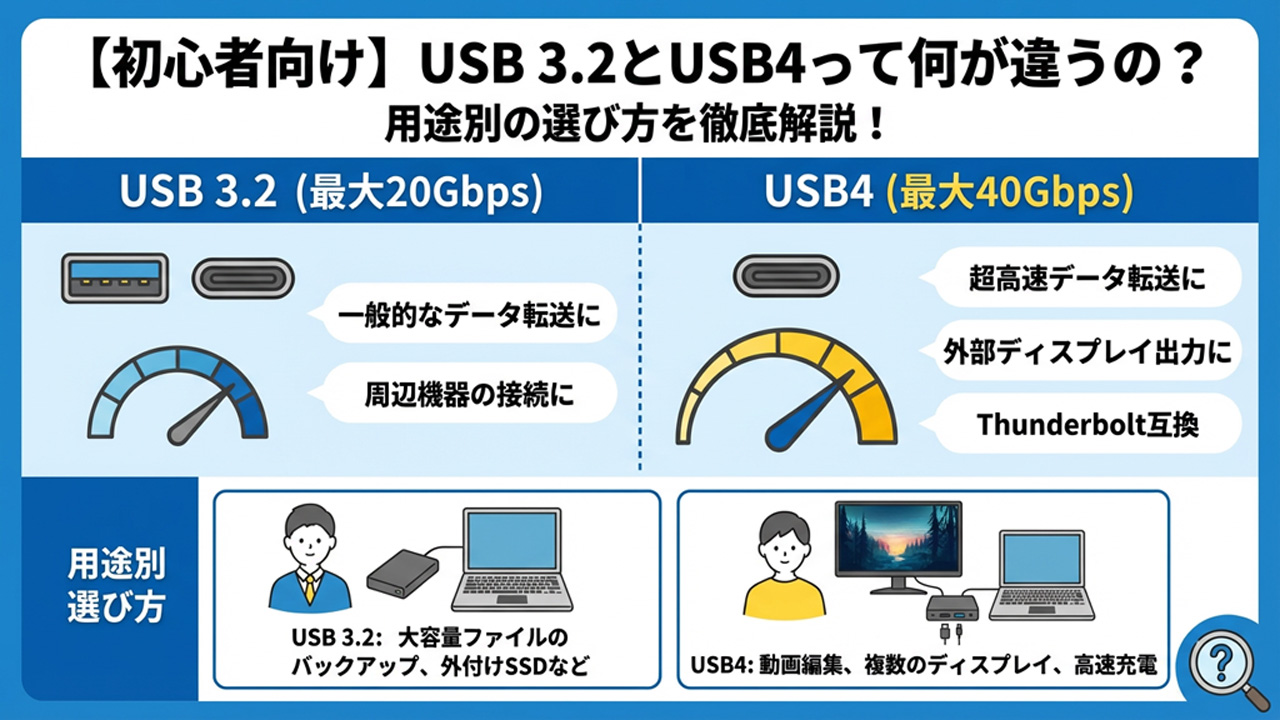 数字で見ると違いは一目瞭然。USB4は「次世代の超高速モデル」、USB 3.2は「現役の標準モデル」です。